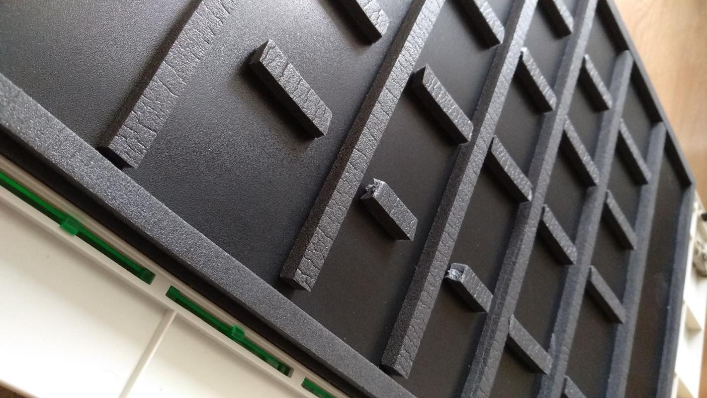 Поэтому я немного доработал свой «встроенный короб Mustek-а» — наклеил дополнительные прижимные уплотнители с таким расчетом, чтобы они попали в промежутки между зачетными зонами. Вот таким образом: