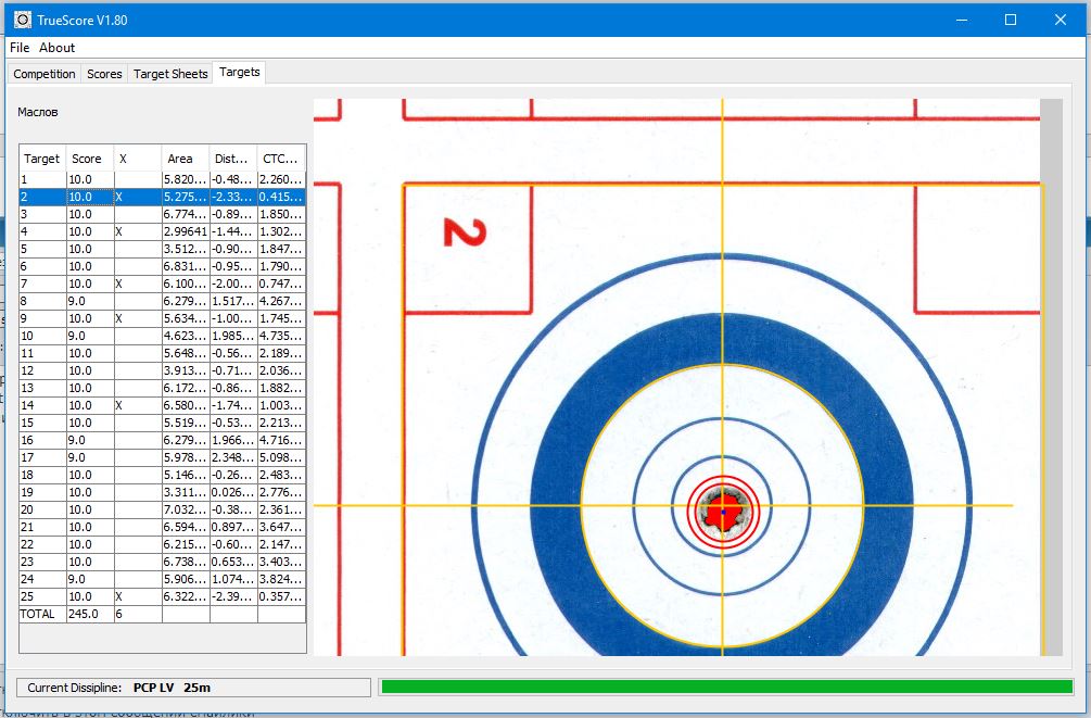 Результат 245/14. Запнулась только на 19 мишени, 21-ую проглотила без вопросов и посчитала ее как среднее между двумя пробоинами