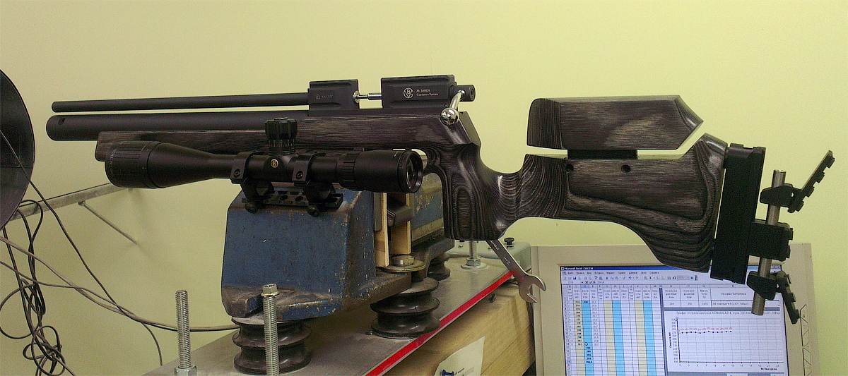 Внутри трубы - хрон. Рядом комп, который онлайн берет информацию с хрона и выводит график отстрела, расход и т.п. На тисках оптика, позволяющая наблюдать за попаданиями.