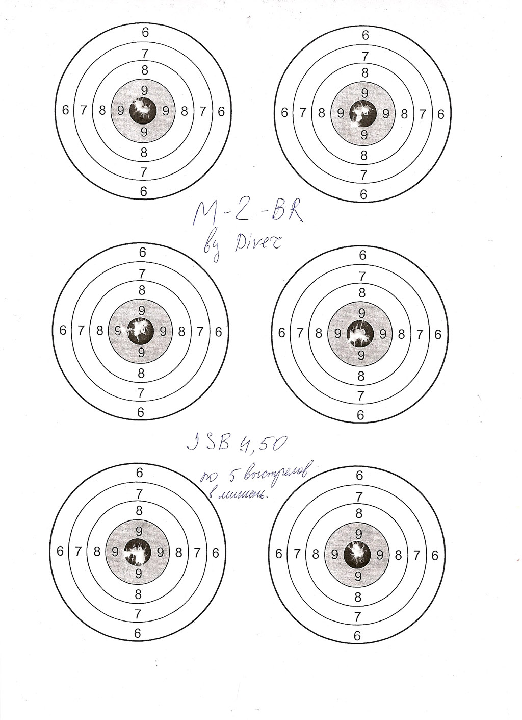 Вчера первый раз отстрелял в тире. Безо всяких ухищрений, винтовка стала стрелять практически сразу. Перебрал разными пулями для пробы. Самые лучшие оказались JSB 4,50. На полтиннике - мишень не забрал - но кучность приличная получилась - не более 10мм точно. Вот мишень на 25м. Здесь все мишени отстреляны по пять выстрелов подряд с одной заправки. Есть очевидные два отрыва, но, думаю, по моей вине. Лучшая группа тут имеет кучность 1мм, то есть 0,13МОА (правая нижняя).