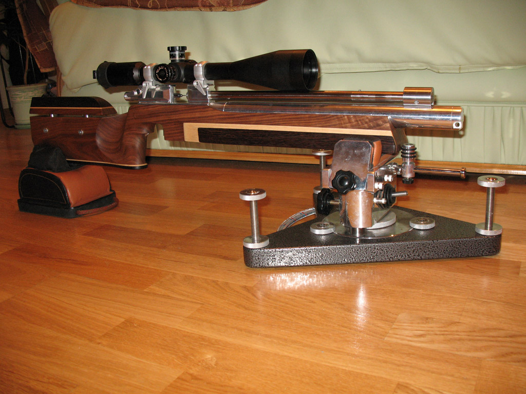 Пока собрана, стреляет. Еще не настроена, ждет дерева. Винтовка планируется для класса Heavy Varmint Class A (20,34 Дж). Имеет цельный 16мм ствол Steyr, индивидуально изготовленные внутренности - ударники, досылатель, взводитель... Отдельная партия корпусов редукторов - с одним отверстием под Виковский манометр. Редуктор последней серии - с торцевым уплотнением седла клапана (ранее был с конусным). Все работы на стволе выполнены вручную, сборка и подгонка деталей сделана мной.